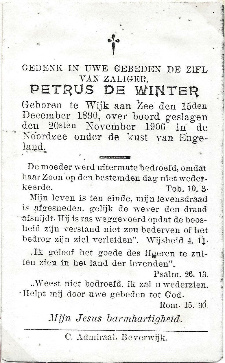 Zoon Piet had als jonge knaap werk gevonden op een vissersboot. Op een kwade dag in november 1906 kwam het schip niet ver van de Engelse kust in een zware storm terecht. Piet sloeg overboord en verdronk. Hij was pas 15 jaar.